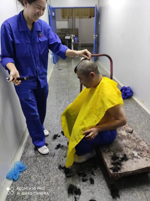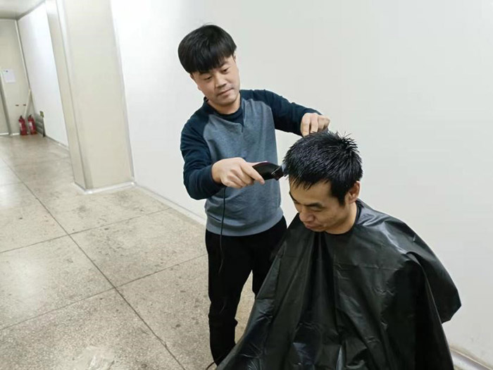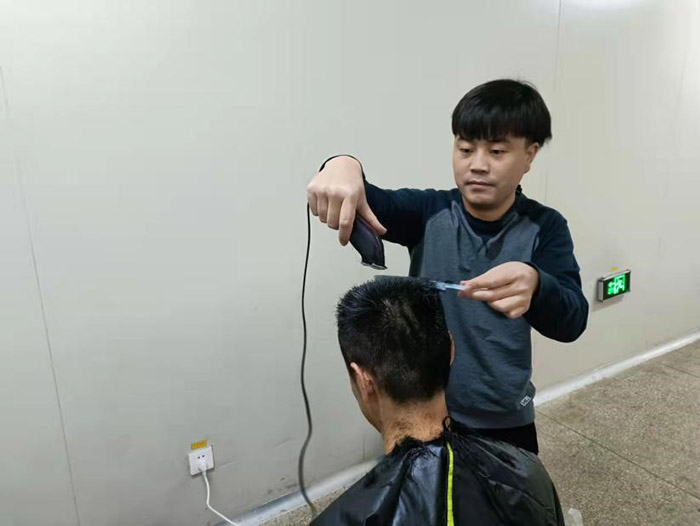 這一幕發(fā)生在11月21日公司中提車(chē)間。疫情阻擊戰開(kāi)始至今已將近一月,為做好抗疫情保生產(chǎn)工作,公司采取了封閉式管理。500多名干部員工駐廠(chǎng),堅守崗位,加班加點(diǎn),維護了廠(chǎng)內良好的生產(chǎn)生活秩序。然而,封控近一個(gè)月,越來(lái)越多的人有了理發(fā)需求。尤其是男職工,一個(gè)個(gè)發(fā)壓眉、鬢過(guò)耳,凌亂而萎靡的樣子,讓人看在眼里急在心里。