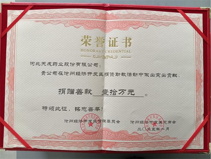 2024年,在滄州經(jīng)濟開(kāi)發(fā)區黨工委、管委會(huì )的引領(lǐng)以及市委統戰部、市工商聯(lián)的指導下,天成藥業(yè)協(xié)同園區各會(huì )員單位攜手奮進(jìn)。憑借各方的共同努力,區總商會(huì )榮獲滄州市“四好”商會(huì )稱(chēng)號,天成藥業(yè)也成功入圍2024河北省民營(yíng)企業(yè)百強系列榜單。