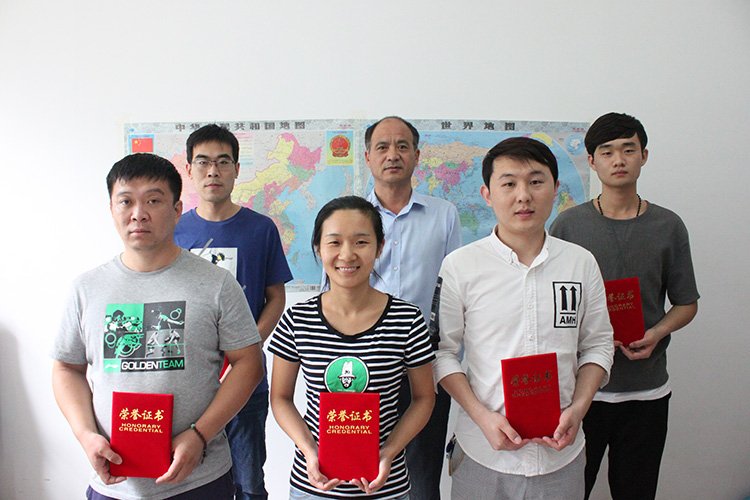 優(yōu)秀員工與領(lǐng)導合影:(后排從左向右)高杰、王顥(常務(wù)副總)、李炳盈;(前排從左向右)王越、李海玲、王帥