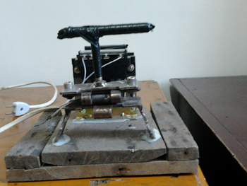 自制熱熔壓片機初級產(chǎn)品制作完成的那天,我們很激動(dòng),像迎接一個(gè)新生的嬰兒,又像學(xué)生答完考卷等待老師的評分??墒?,初期的試驗結果卻給我們潑了一盆冷水。自制熱熔壓片機初級產(chǎn)品制出的樣品薄厚不均,透明度差,根本不符合紅外光譜檢驗的要求,在這種情況下,我們沒(méi)有灰心,經(jīng)過(guò)進(jìn)一步的技術(shù)討論,發(fā)現熱熔壓片機的構型是對試驗結果影響最大的因素。我們自制的熱熔壓片機由下列四部分組成:電源連接部分、控制變壓器、加熱板和成型板。制取薄片樣品時(shí),采用絕緣電線(xiàn)與電源連接,為自制熱熔壓片機供電;通過(guò)控制變壓器獲取合適的電壓為加熱板供熱;將樣品置于加熱板上;手壓成型板,與加熱板重合擠壓樣品成型。其中加熱板采用手動(dòng)壓片的方法,這就是造成實(shí)驗失敗的根本原因。